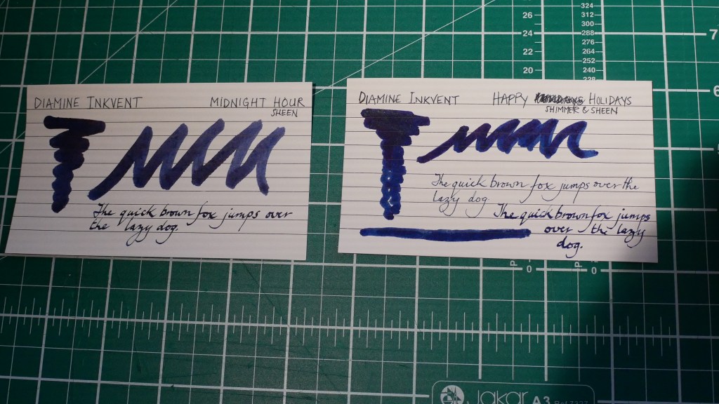 This is very definitely a blue born of the midnight hour with blue-violet undertones and copper sheen. It is a very sophisticated and dark blue saturated ink that is a pleasure to write letters with.