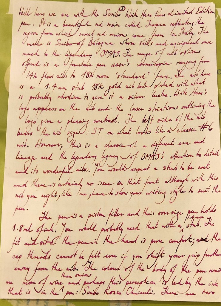Scriturra Bolognese have done an excellent job with this pen and Write Here Pens are offering a beautiful pen that reeks quality in form and function. Writing with it does feel special. I would definitely buy it in preference to certain other luxury brands’ LE offerings. Write Here collaboration with the Bolognese pen craft masters has created a cracking pen, which, IMO at £530 for a top-class nibbed piston-filler seems great value for money.